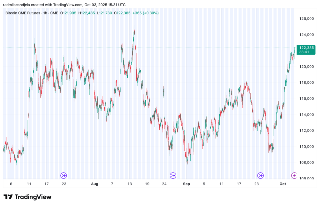 Graph showing the price of Bitcoin futures and the CME gap from July 2 to Oct. 3, 2025 (Source: TradingView)